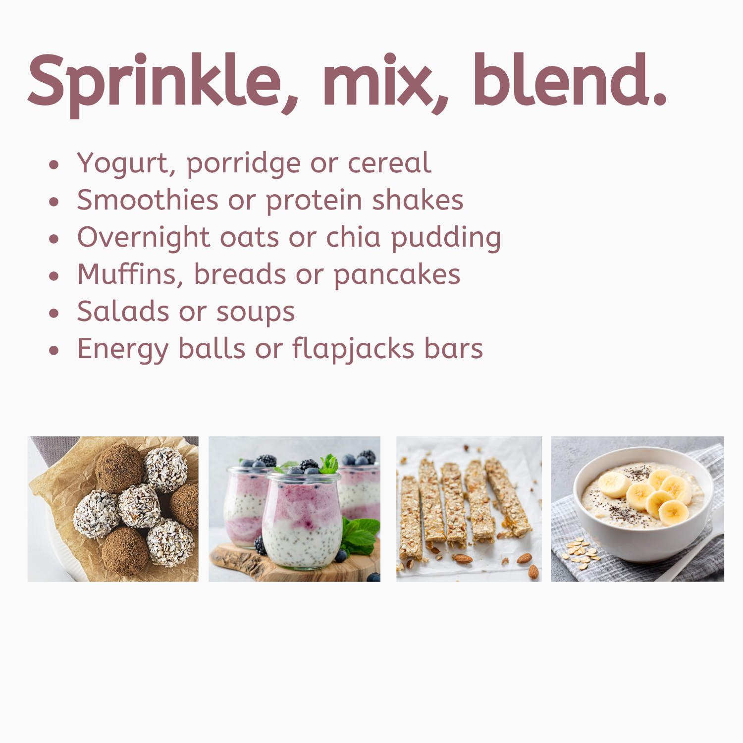 • Sprinkle it over food: yogurt, cereal, oats. chia puddings, salads etc