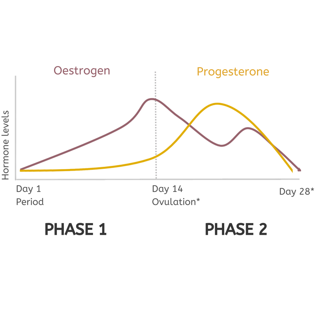 Mid-cycle (Ovulation): Oestrogen dips while progesterone rises. You may feel more emotional or experience subtle shifts in energy.